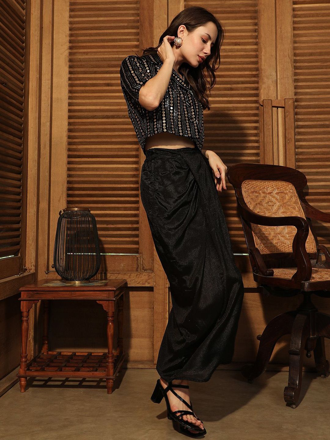 Black embellished top, has a shirt collar neck and short sleeves, Secured with button closure