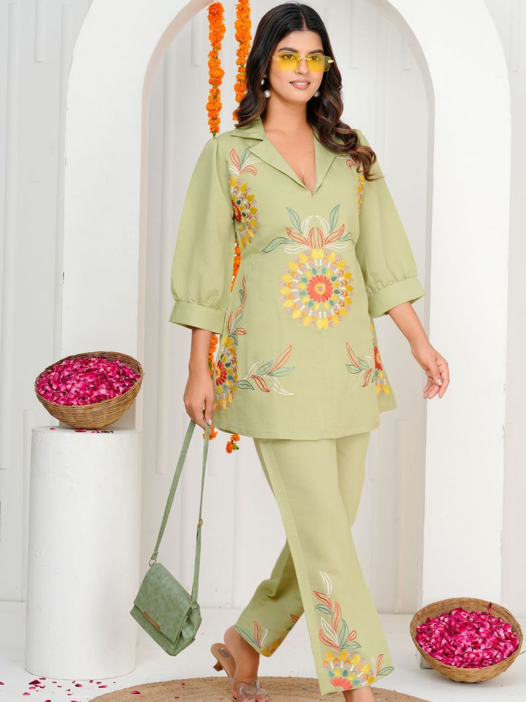 Green, yellow and orange embroidered tunic, has a lapel collar neck and three quarter sleeves, secured with slip on closure