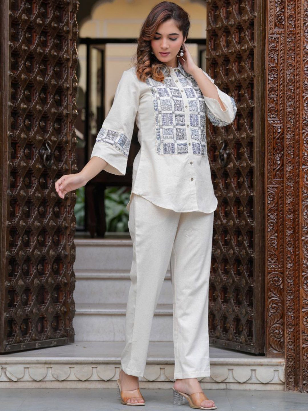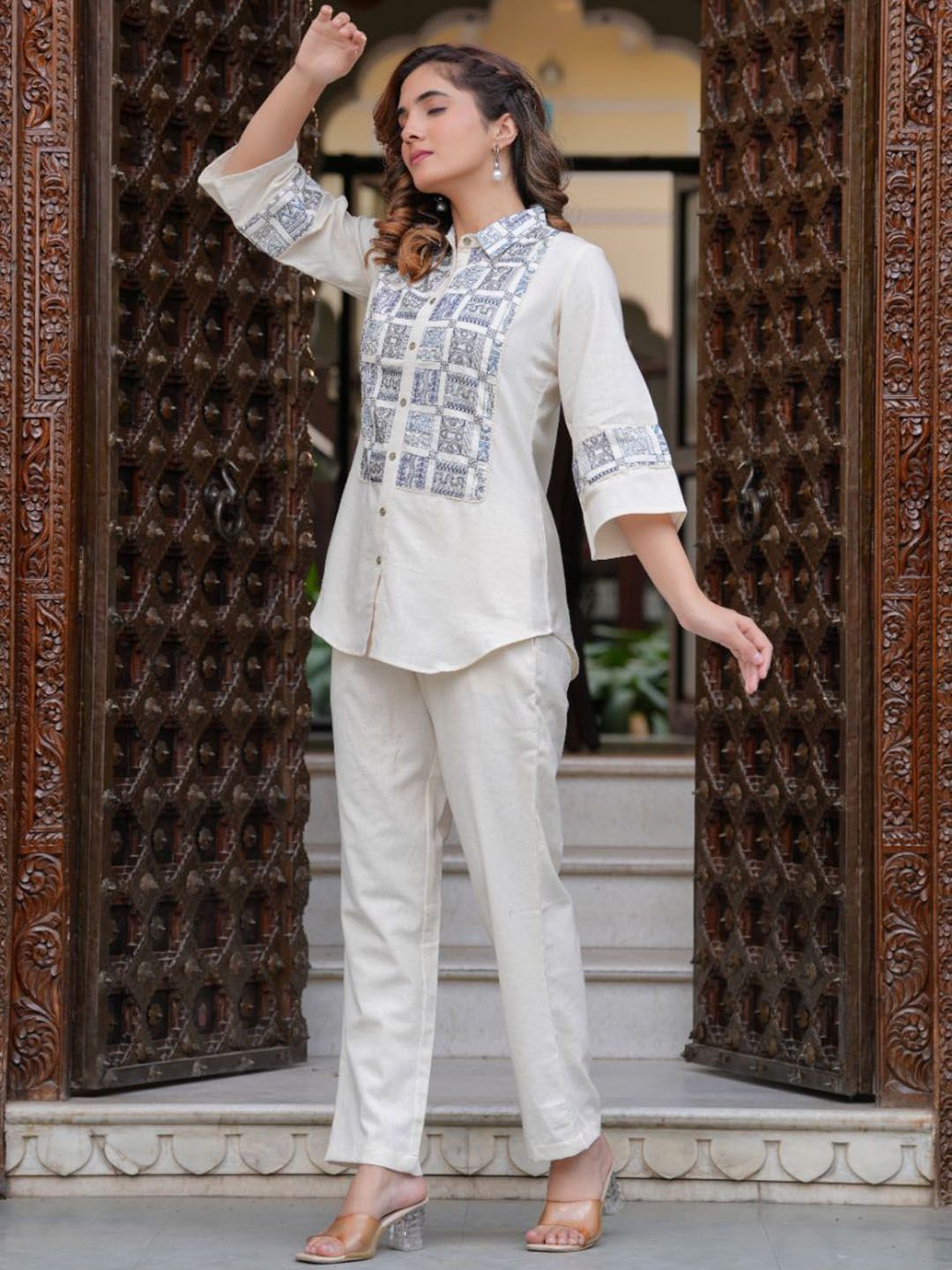 Off white and blue embroidered shirt, has a shirt collar neck and three quarter sleeves, secured with button closure