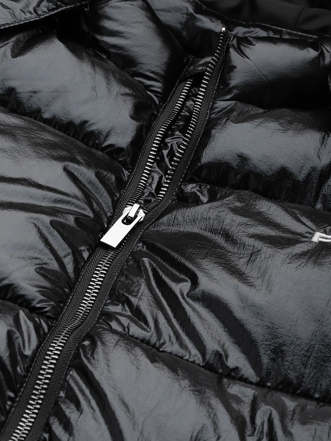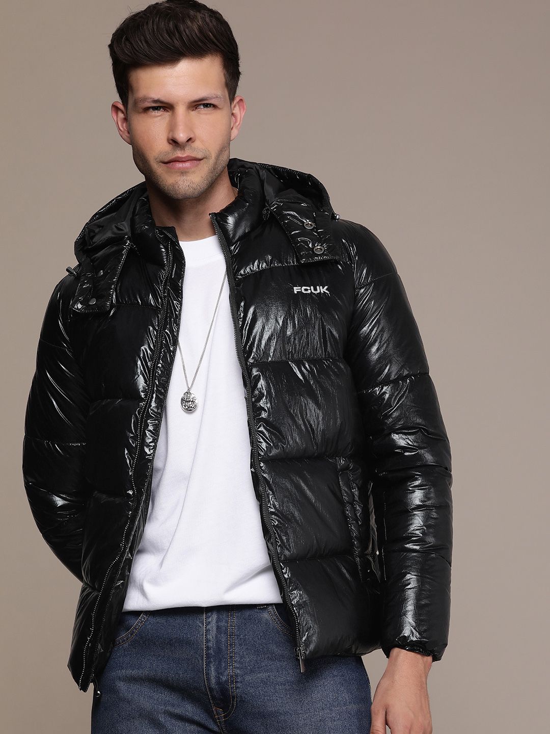 Black solid puffer jacket, has a hooded, 2 pockets, has a zip closure, long sleeves, straight hemline, polyester lining engineered with no