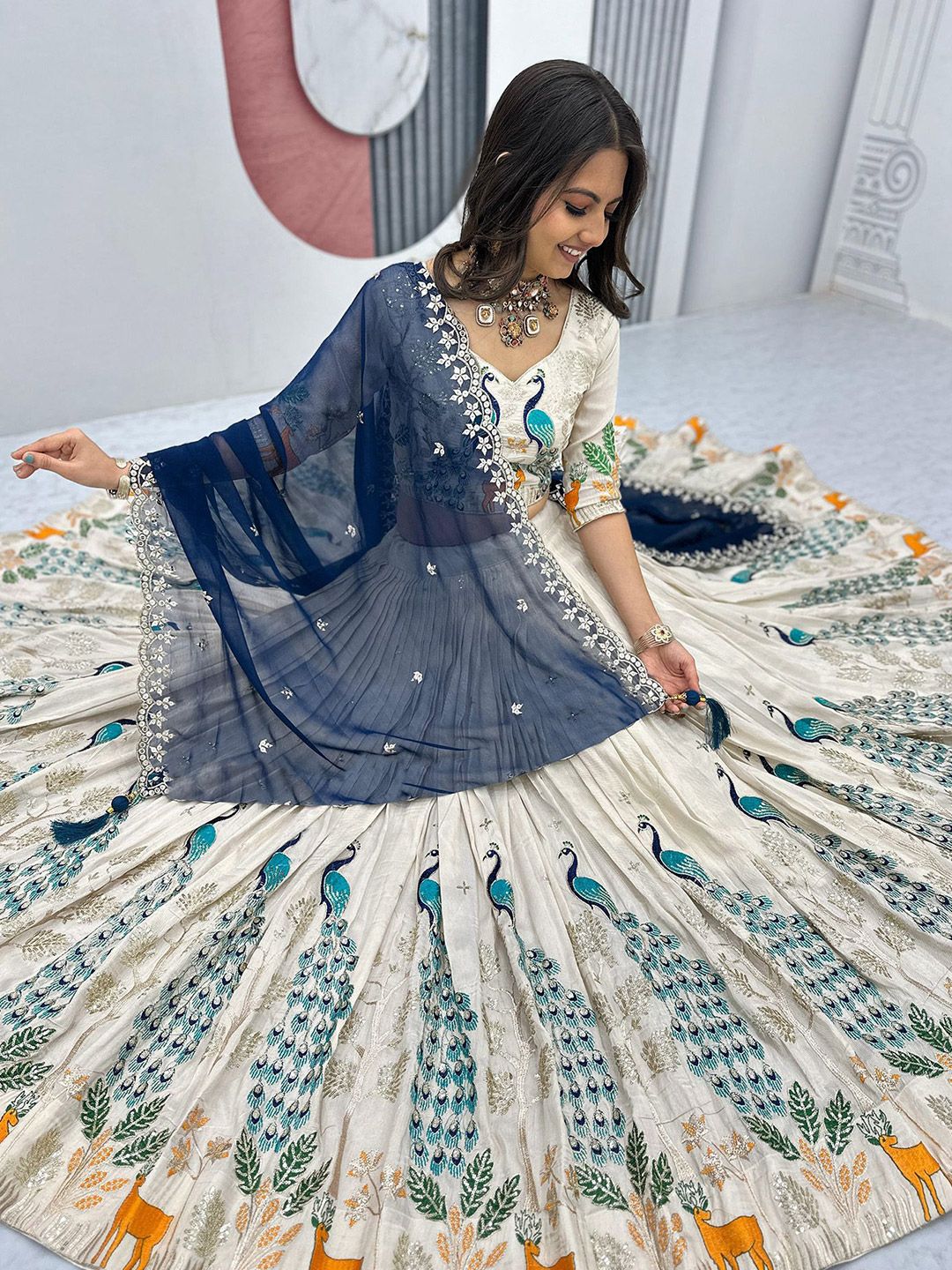 White and blue embroidered lehenga choli with dupatta, sequinned