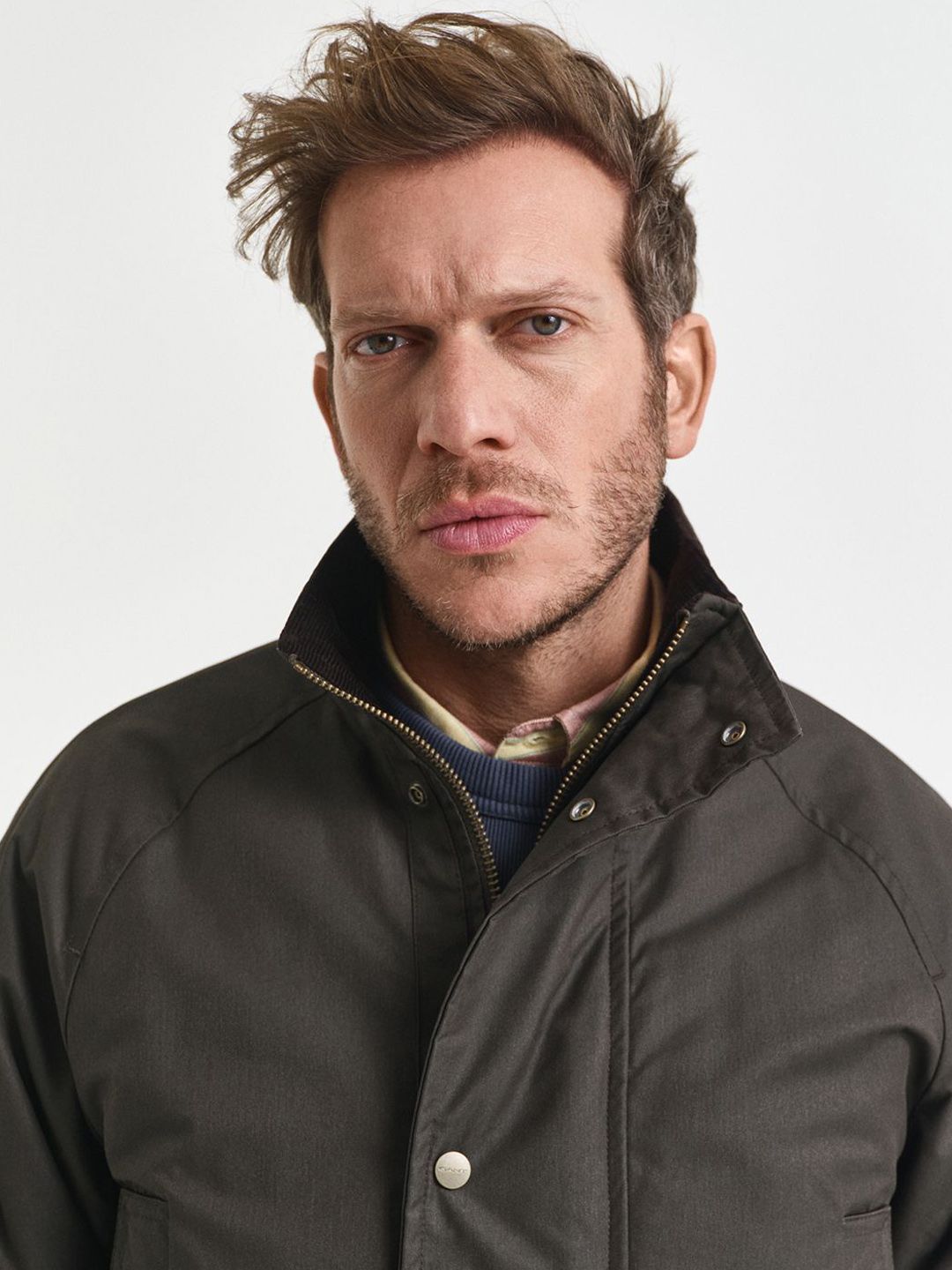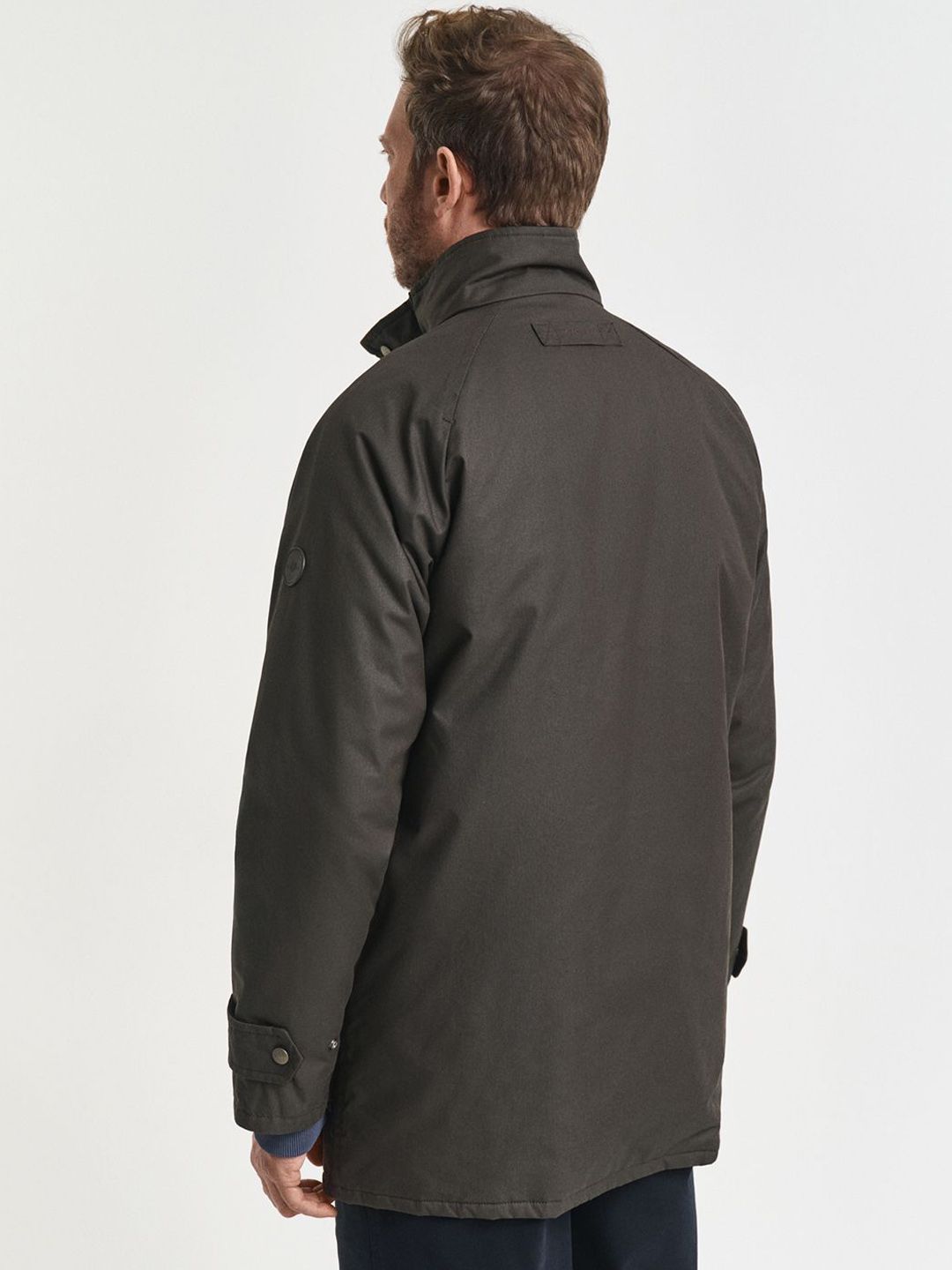 Charcoal solid open front jacket with faux fur trim, has a stand collar, 4 pockets ,has a zip closure, long sleeves, straight hemline, cotton lining