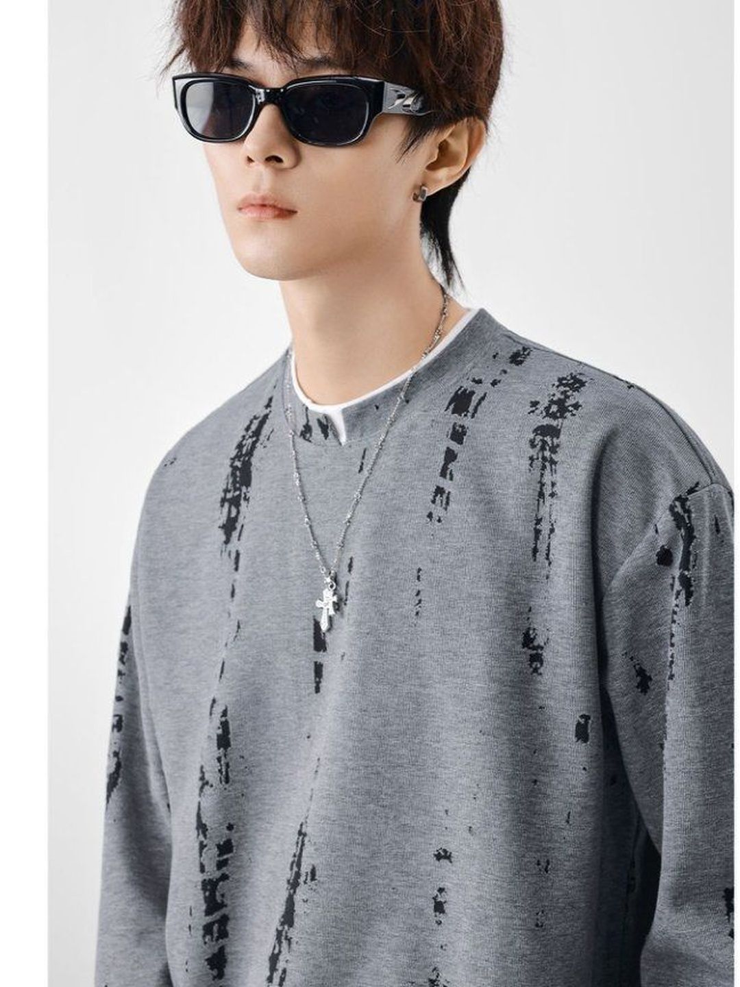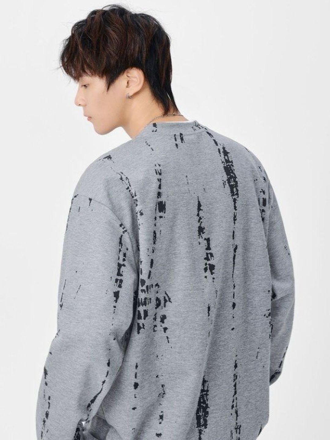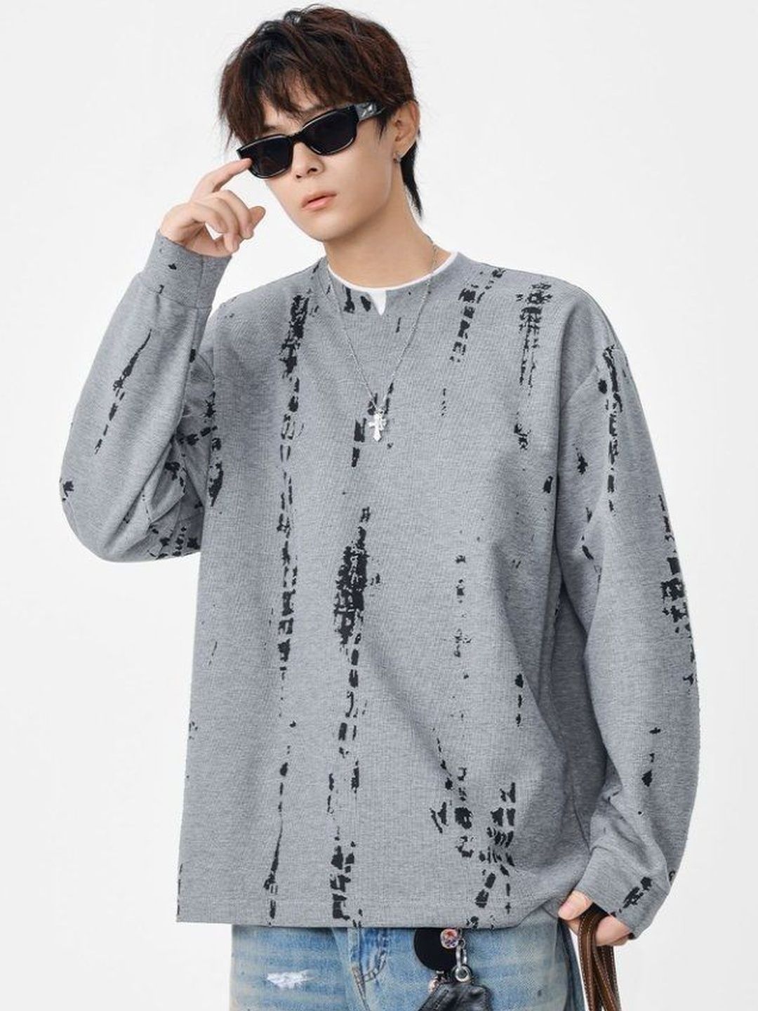 This men’s long-sleeved shirt features , distressed tie-dye pattern in black over a solid grey background. The shirt has a relaxed, oversized fit, making it a comfortable and stylish choice for casual wear. It is designed with a classic crew neck that includes a small V-neck detail.