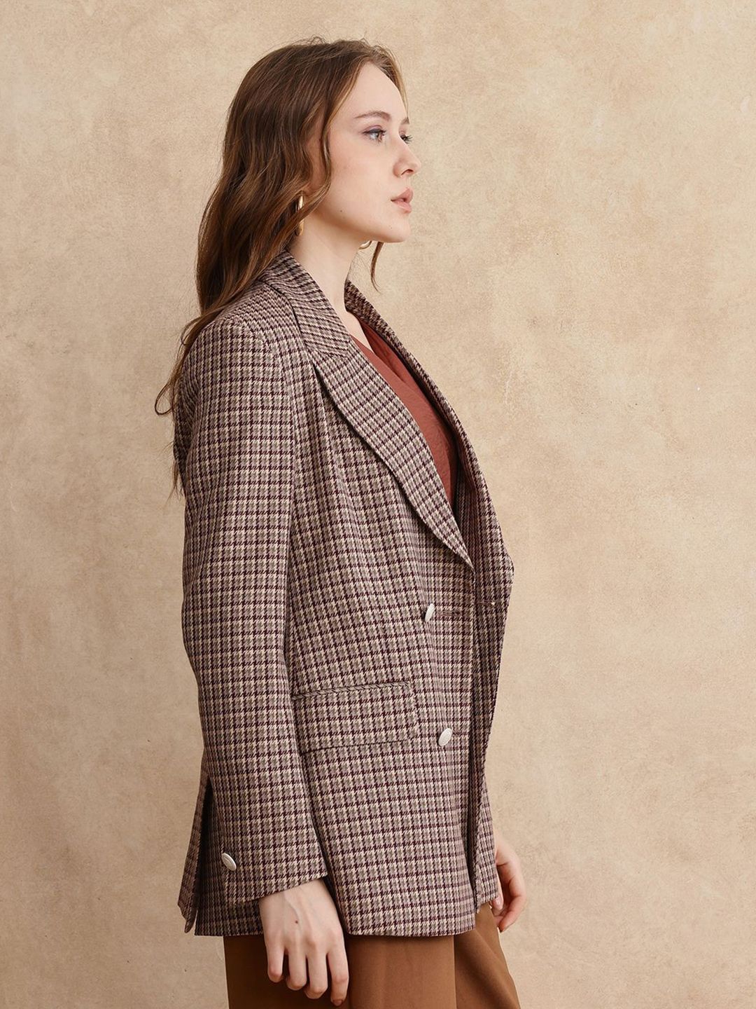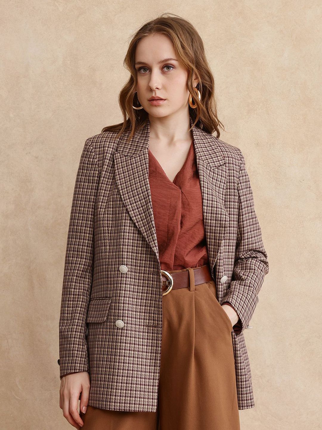 Brown checked slim-fit smart-casual blazer, has a notched lapel, long sleeves, double-breasted with double button closure, two flap pockets, one welt pocket and a ventless back hem