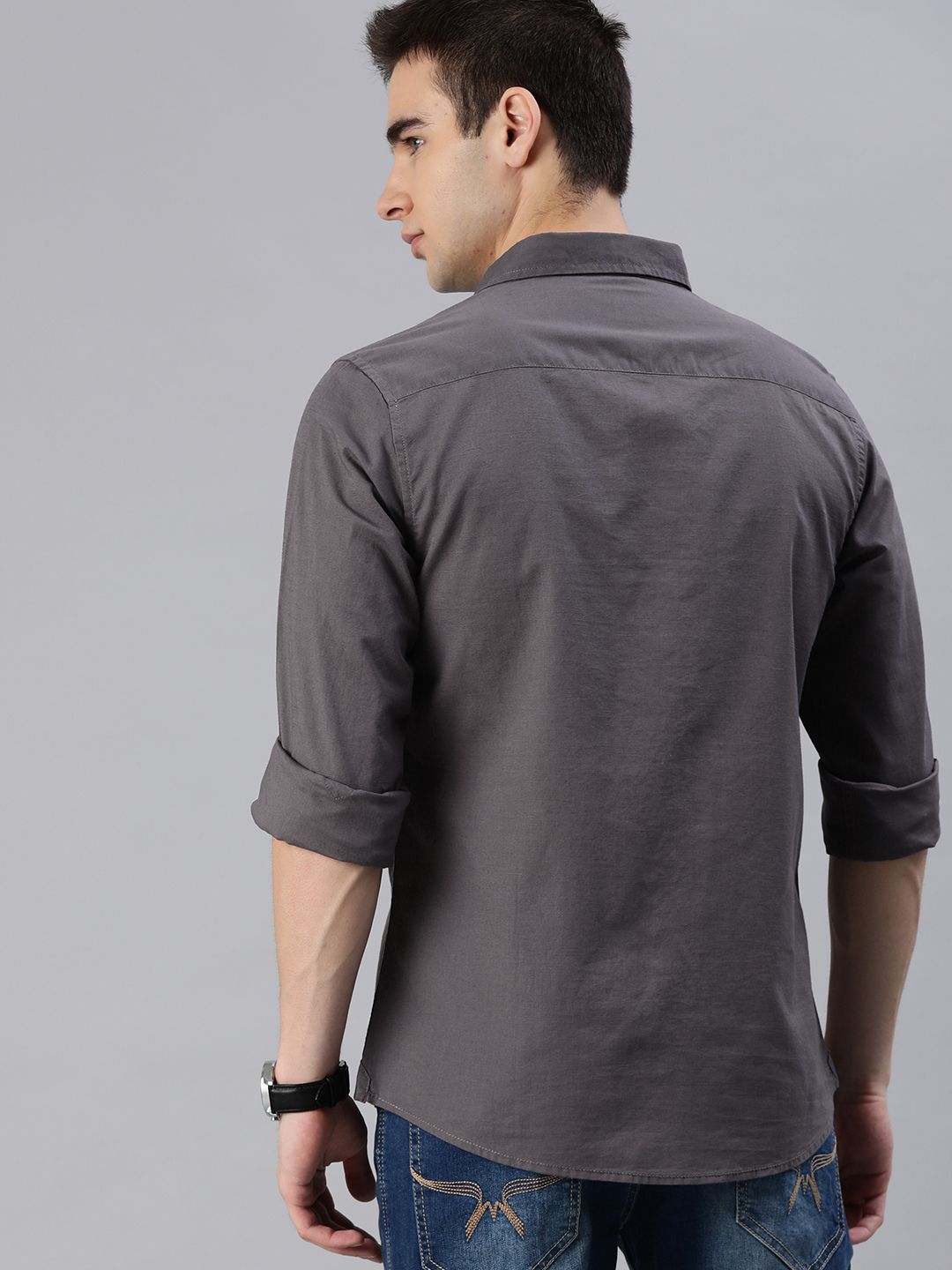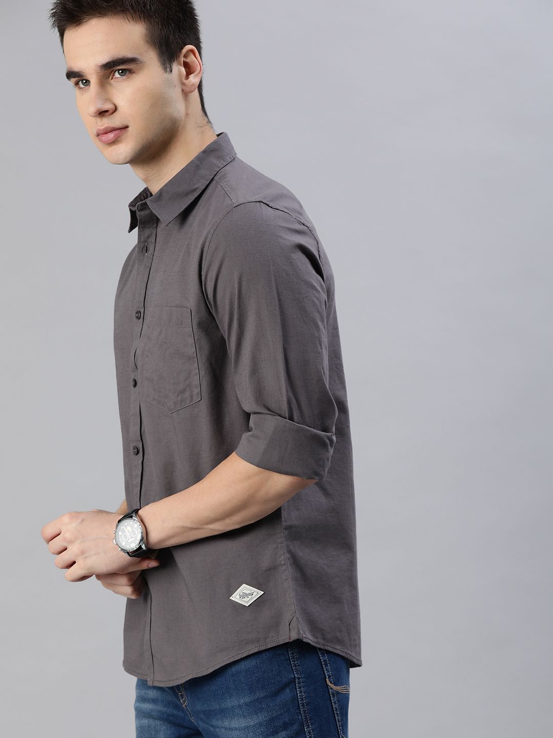 Charcoal solid casual shirt, has a spread collar, long sleeves, button placket, curved hem, and 1 patch pocket