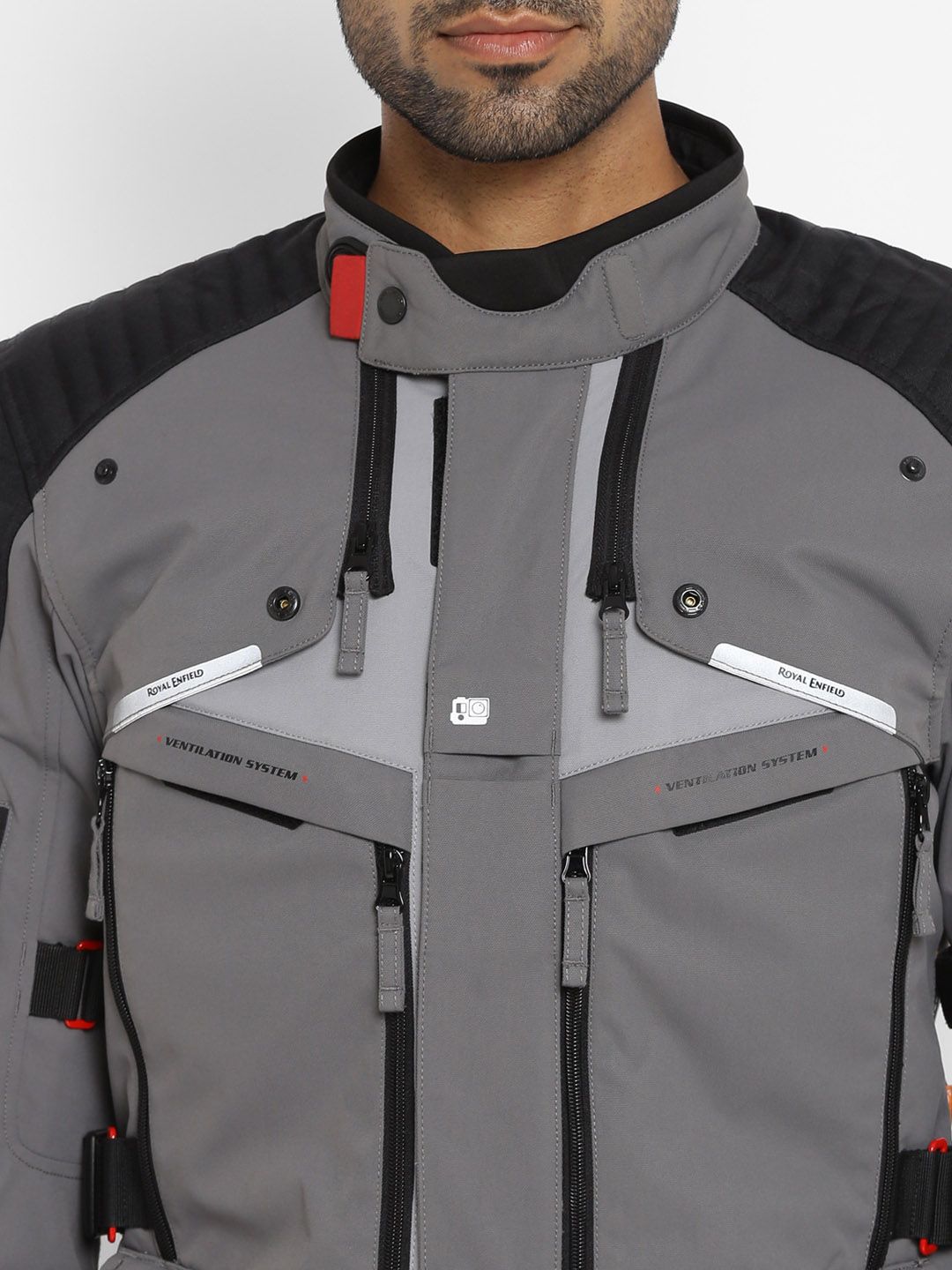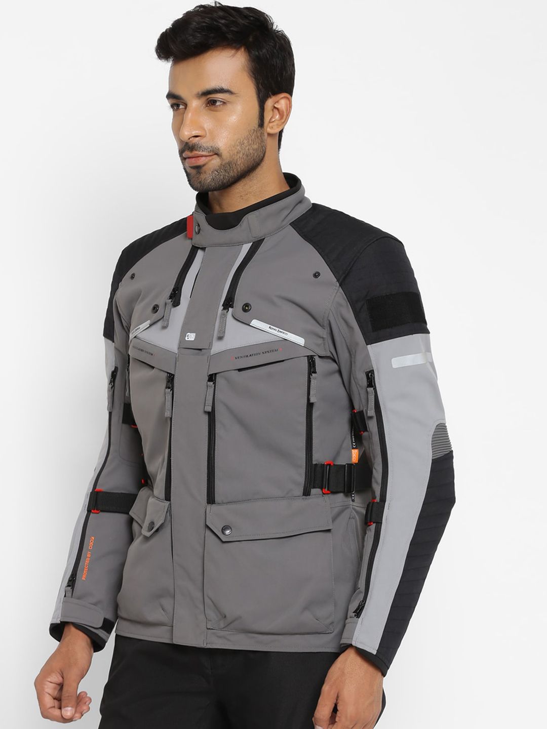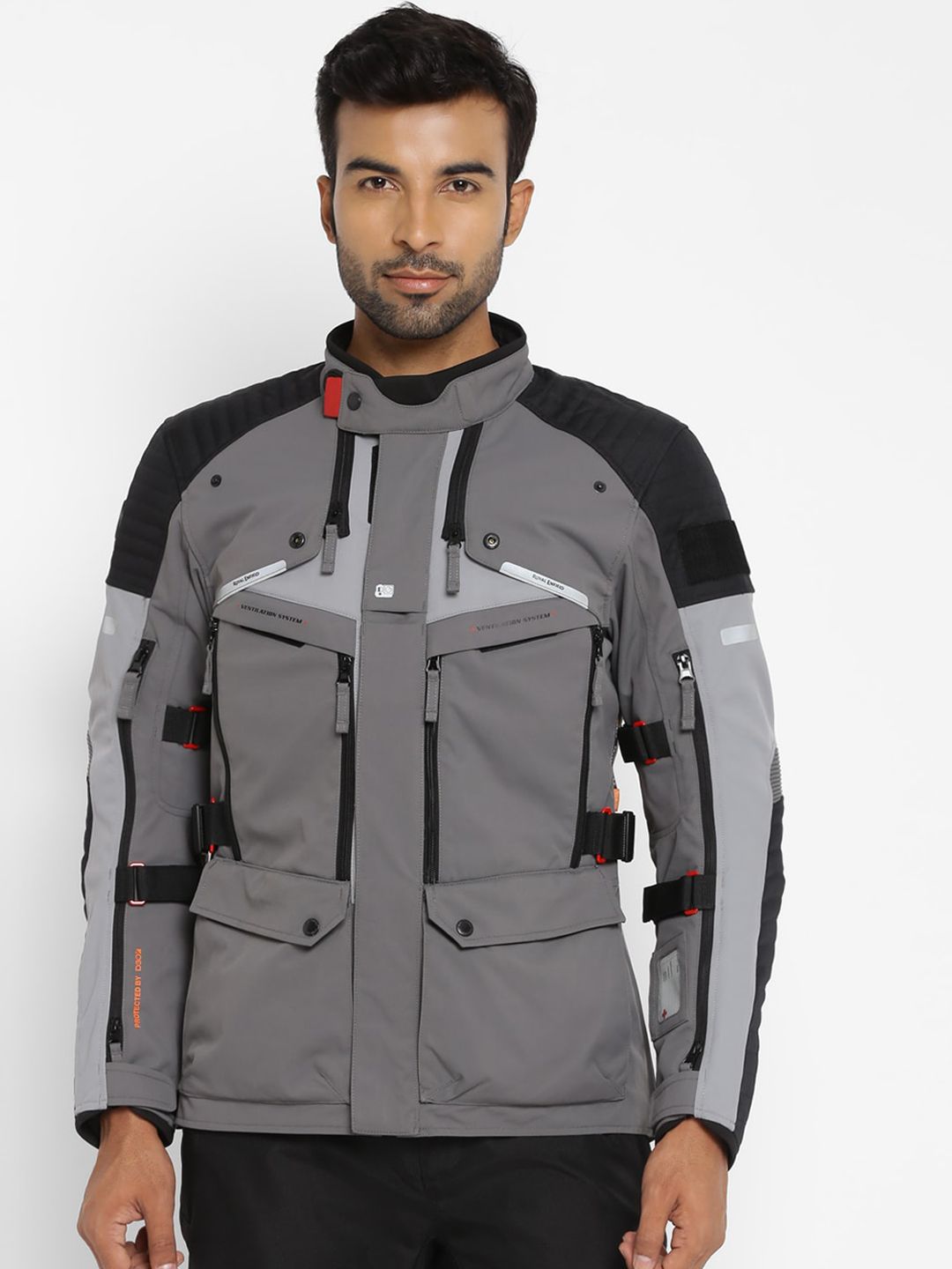 Black and grey solid biker jacket with zip detail, has a mock collar, 2 pockets ,has a zip closure, long sleeves, straight hemline, without lining