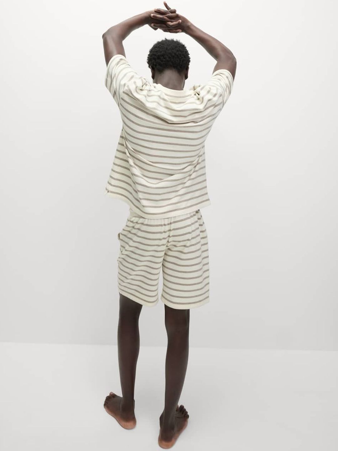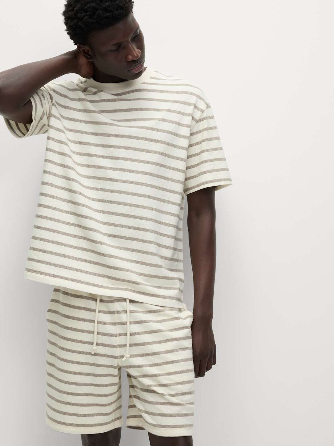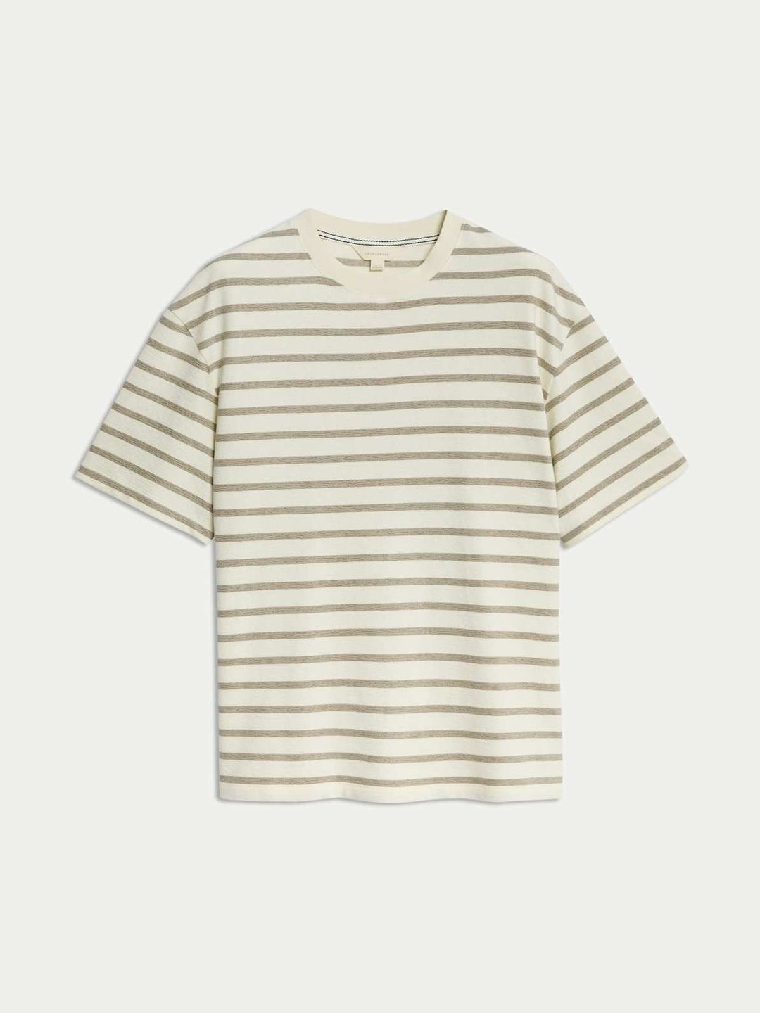 Off-white striped t-shirt has a round neck & short sleeves with a slip-on closure