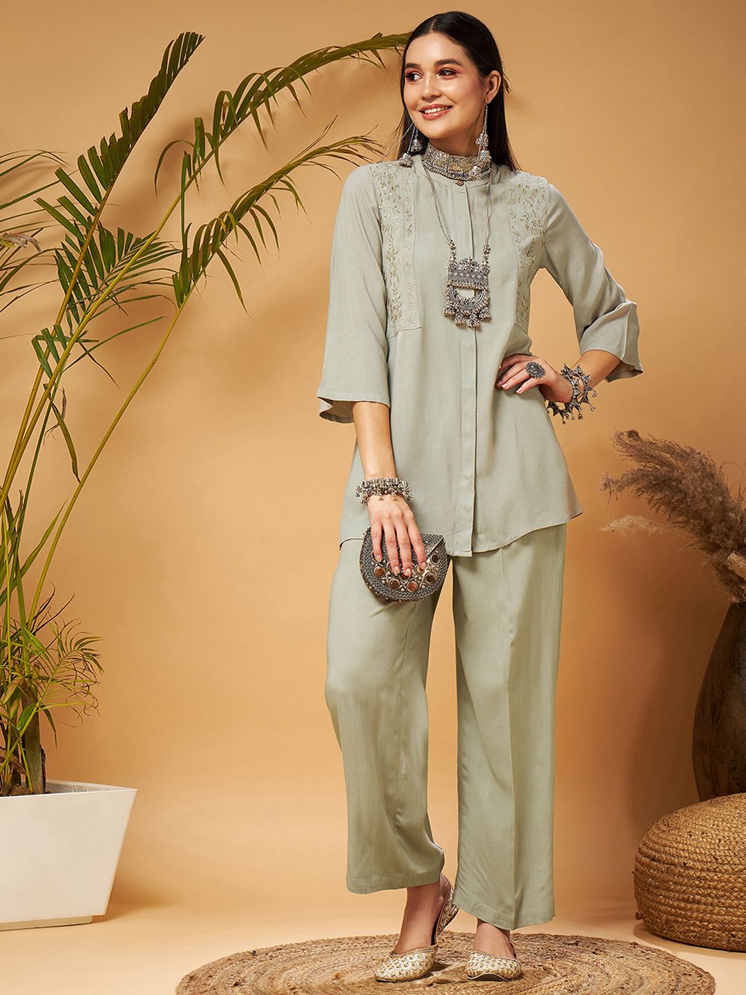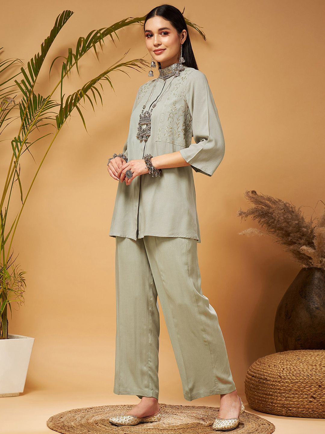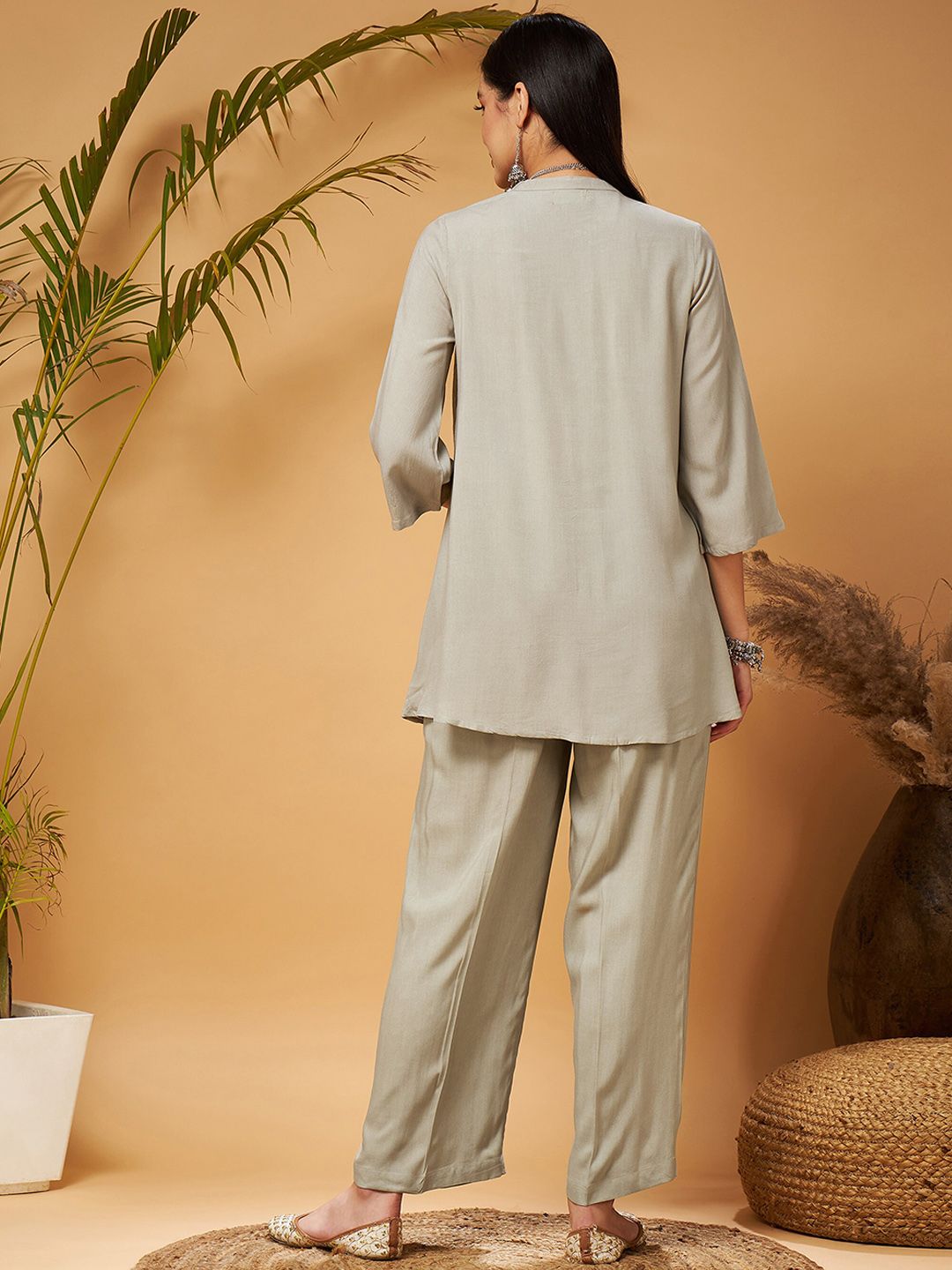 Taupe embroidered Tunic ,has a mandarin collar, three-quarter sleeves